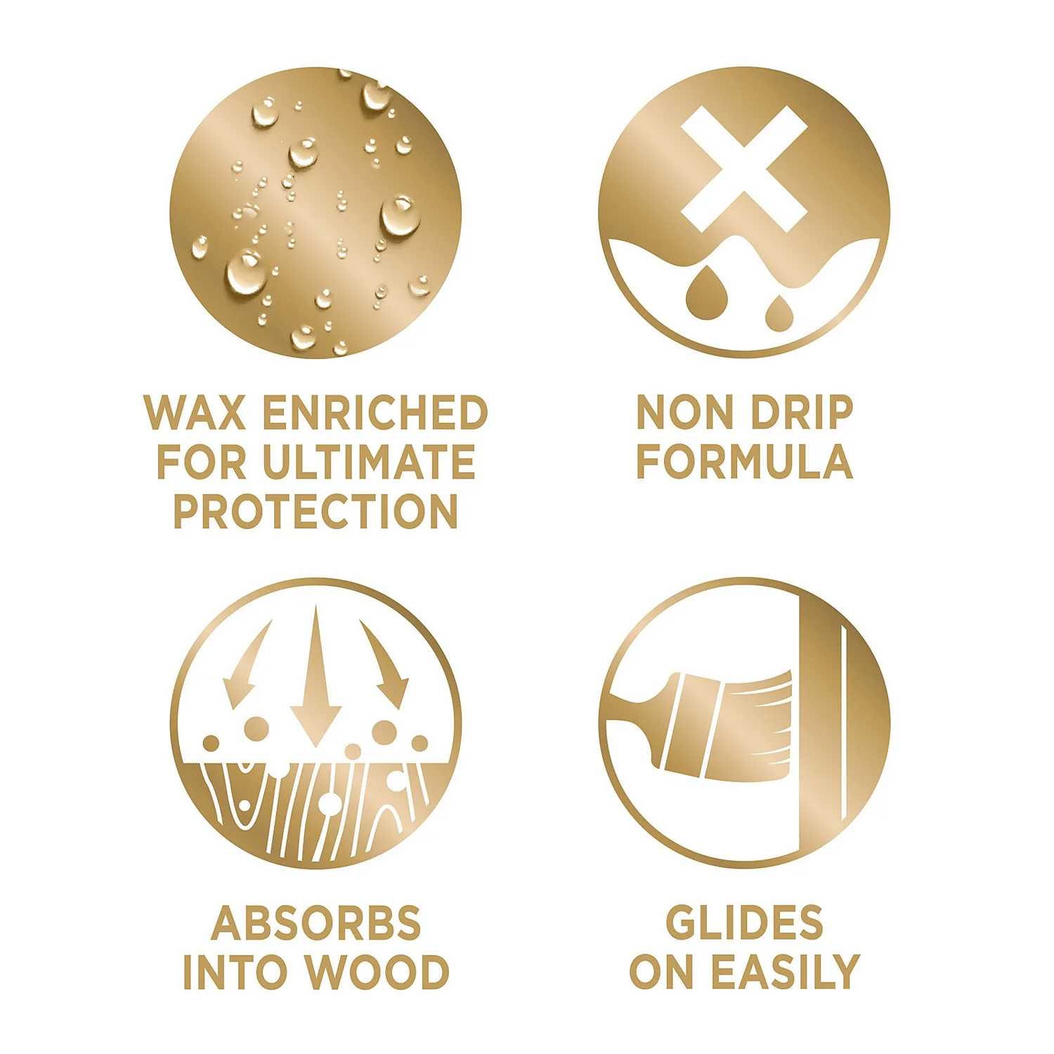 | Additional Information | Stir thoroughly before use, try a test area first to ensure that colour and adhesion are acceptable. Apply 2-3 coats evenly along the grain avoiding overlaps. Allow 2-4 hours between coats under normal weather conditions. This product is wax enriched to repel water. Recoat within 2-3 days of previous coat. If a longer period elapses try a flat a test area to ensure product is not repelled, product performance will be reduced if applied to grey and weathered smooth wood. Do not apply in temperatures below 5C, in damp conditions or if rains likely before the product has dried. Please note that the colour in the tub may be different to the final shade when dry. Where a strong colour change is involved, more coats may be required. If using more than one can it is advisable to mix them together in a larger container or finish in a corner before starting a new can. |
