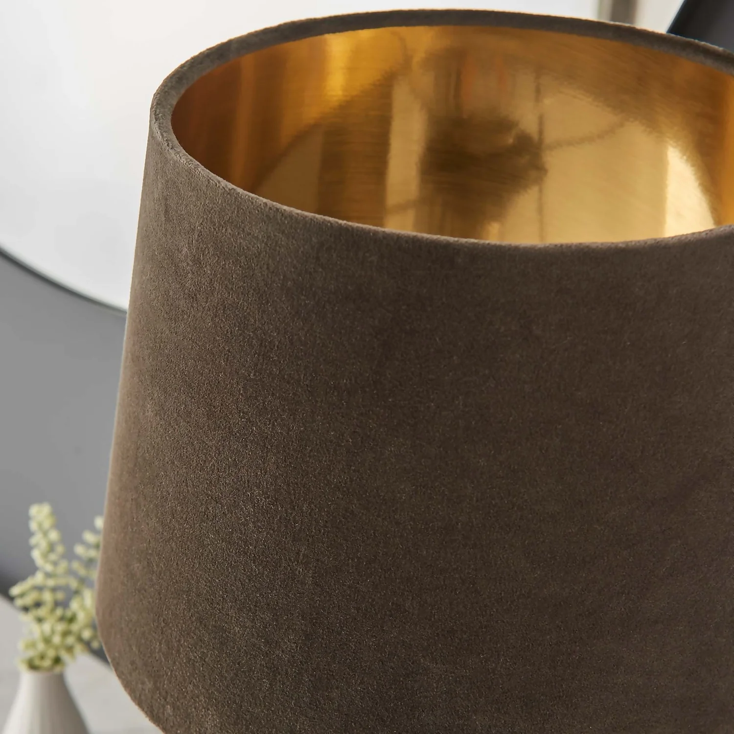 Timeless combination of mocca velvet shade and rose ribbed glass base. A table lamp perfect for a variety of rooms.