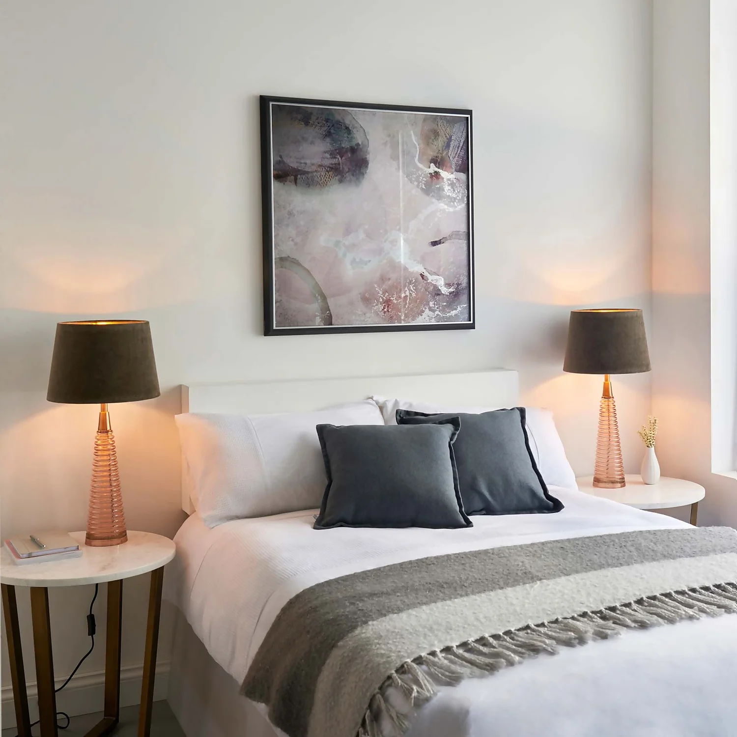 - Finished in rose pink ribbed glass, antique brass plate and mocha velvet