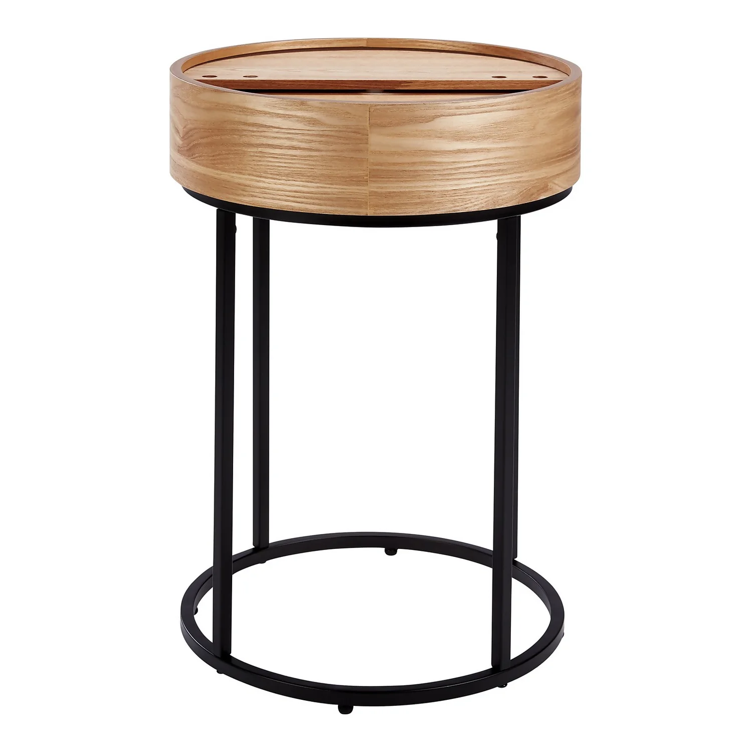 The Halo natural ash side table has a hidden storage space in the table top and an elegant black metal base.