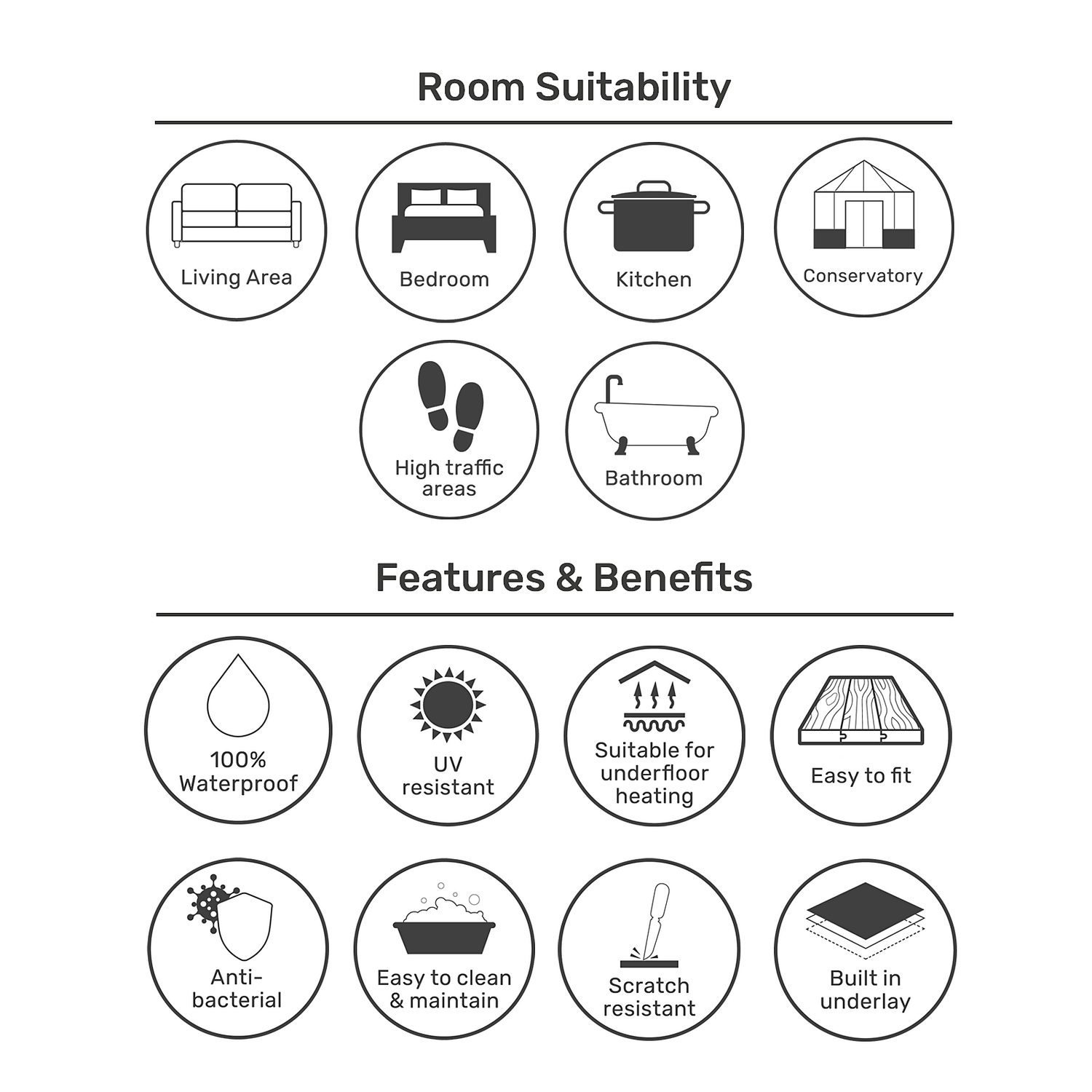 | Rooms Suitable For | Kitchen, bathroom, living areas, conservatory, high traffic areas |