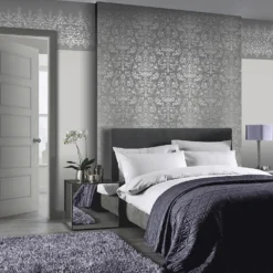 Arthouse Kyasha Damask Embossed Metallic Foil Silver Wallpaper